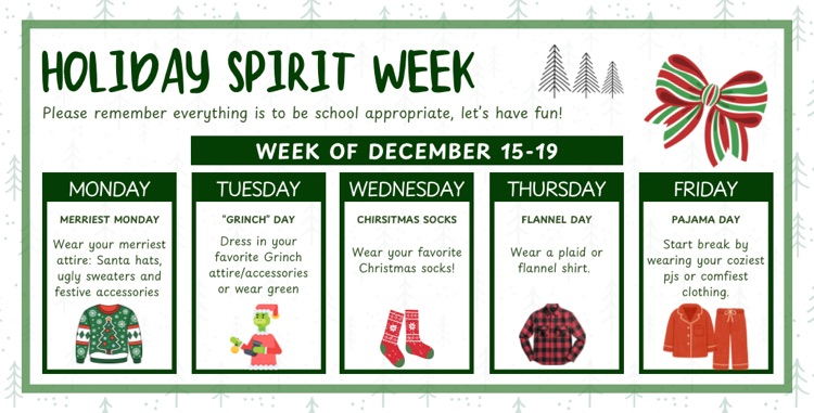 Maple parents and students, here's the flyer for Holiday spirit week for this week. We're excited to see all the merry, cheerful faces as we finish this week strong!